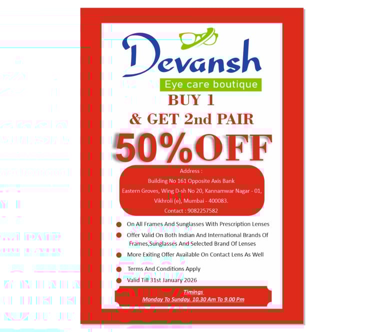 Devansh Eye Care Boutique in Vikhroli East, Mumbai, is your trusted destination for complete eye care and premium eyewear solutions. We combine advanced vision testing with a curated collection of stylish eyewear to deliver comfort, clarity, and confidence to every customer.